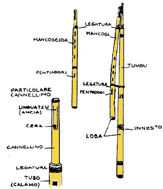 It is an instrument with very ancient origins able to produce polyphony, it is played with the circular breathing technique and it is built using different kinds of canes. The instrument is created by three different canes, of different size and thickness, with the cabitzina at the top where the reed is obtained.