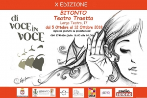 Festival metropolitano Di Voce in Voce, X edizione a Bitonto Prende il via il cartellone della X edizione del Festival metropolitano “Di Voce in Voce” che proporrà sei concerti di pregio all’interno del Teatro “Tommaso Traetta” ad ingresso gratuito su prenotazione. La kermesse è realizzata con il sostegno della Regione Puglia, del Comune di Bitonto, della Fondazione Nikolaos, del Coar (Cooperativa artisti) e le associazioni Arte in Viaggio e Echo Events; media partner del Festival 2018 è Radio Selene. …