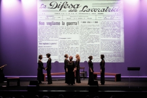 “Il fronte delle donne” di Lucilla Galeazzi a teatro Lucilla Galeazzi Maria Rosaria Omaggio e il gruppo vocale Levocidoro con Stefania Placidi – chitarra Impressioni visive realizzate dal videoartista Carlo Fatigoni Fonica Eugenio Valente – Luci Stefano Berti regia di Maria Rosaria Omaggio Senza il loro lavoro, il Paese di sarebbe fermato. Eppure il loro ruolo è sbiadito, spesso distorto. Quasi completamente omesso. Dov’erano e dove sono le donne che hanno partecipato al farsi della storia? Perché scompaiono così facilmente…