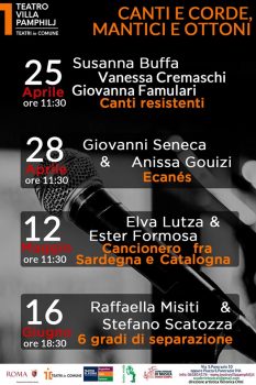Si prosegue domenica 28 aprile (ore 11.30) con l’ibridazione mediterranea di Giovanni Seneca & Anissa Gouizi, poi il 12 maggio (domenica, ore 11.30) per l’incontro fra tradizione sarda e catalana con Elva Lutza & Ester Formosa e concludersi il 16 giugno (domenica, ore 18.30) con un giro del mondo in musica in compagnia di Raffaella Misiti & Stefano Scatozza, anima degli Acustimantico.