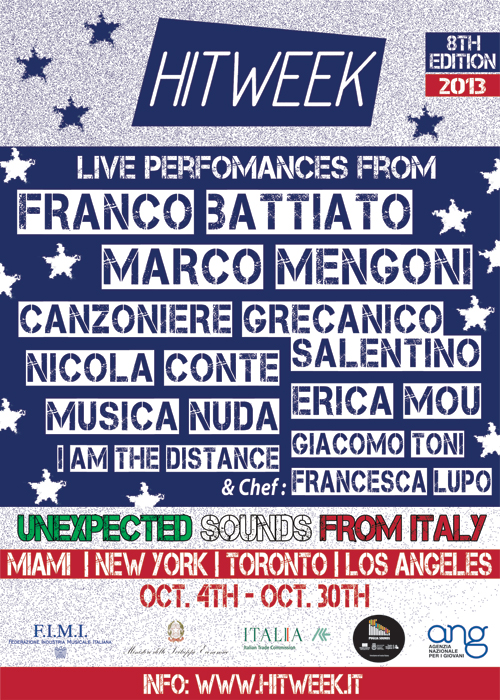 Hit Week 2013L'evento si è tenuto negli States dal 4 al 30 ottobre: da Los Angeles a Miami, da New York a Toronto, la musica italiana ha trovato una sua seconda casa, abbracciata dai tanti italiani residenti all'estero e da quanti continuano ad apprezzarla nel tempo.