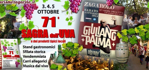 Da venerdì 3 a domenica 5 Ottobre 2014 Zagarolo, come altri paesi d'Italia, sarà il protagonista assoluto della 71° Sagra dell’Uva, un evento straordinario fatto di arte, musica, vino e buon cibo. Un evento fortemente legato alla terra e alla tradizione. Artigiani e contadini, come ogni anno, il primo week-end di Ottobre daranno l'opportunità a turisti, amanti del buon cibo e del buon vino, curiosi e appassionati di visitare una città viva e vera di 17.476 abitanti in provincia di Roma.