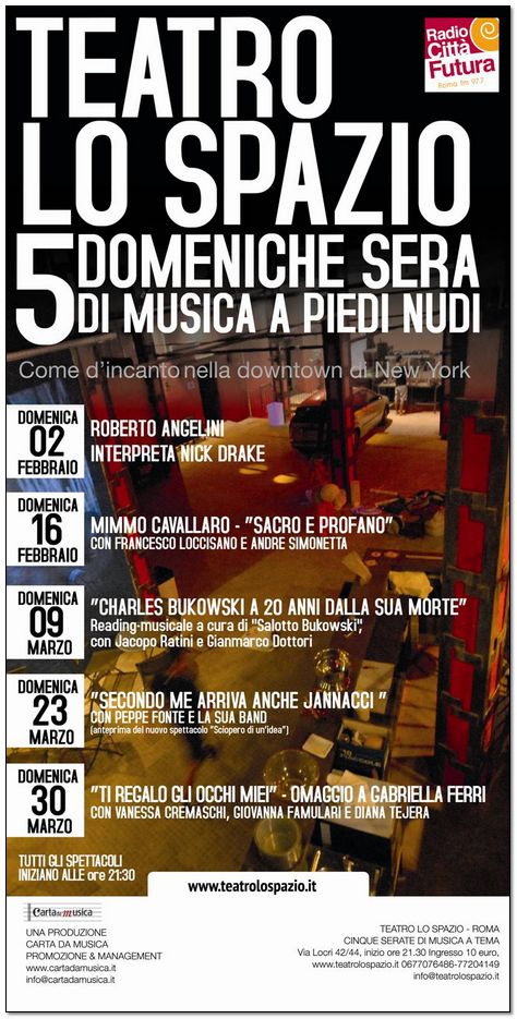 Ieri siamo stati a Roma. Al Teatro Lo Spazio in scena il secondo appuntamento della rassegna Cinque domeniche sera di musica a piedi nudi, curata dall’agenzia Carta da Musica di Roma. Diversi gli artisti che hanno accettato la sfida di condividere emozioni e canzoni.