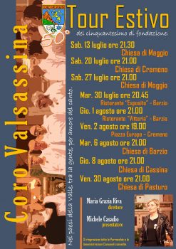 Da cinquant’anni sulla scena delle valli e non solo, il coro Valsassina di Cremeno diretto dal maestro Maria Grazia Riva si prepara al tour estivo che lo vedrà sulla scena valsassinese per ben nove date tra luglio ed agosto. La valle in cui nasce e si radica nel tempo è, grazie anche al “Valsassina”, un nido straordinario di musica ed armonie che decantano la bellezza del paesaggio e lo rendono fonte di ispirazione e riflessione.