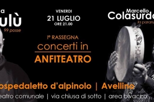 Marcello Colasurdo & Zulù @ Ospedaletto d’Alpinolo (AV) Un bel concerto, in uno scenario stupendo, l’anfiteatro comunale di Ospedaletto d’Alpinolo (AV), una struttura inserita nell’area bivacco…sarà questo il palcoscinico in cui due grandi artisti eseguiranno il loro concerto. Aprirà Marcello Colasurdo con la sua Paranza, interprete della canzone tradizionale vesuviana e voce storica degli Zezi, a partire dalle 21.00 sarà protagonista con il gruppo con cui suona dal 1998. Colasurdo con la sua storia artistica è un personaggio legato ad Ospedaletto…