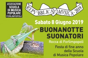 Buonanotte Suonatori @ Forlimpopoli (FC) Torna la Festa di fine anno della Scuola di Musica Popolare di Forlimpopoli. Come ogni giugno da ormai oltre trent’anni, una ricca Notte di Musica per condividere, con tanti amici, un intero anno di lavoro e piacere. Anche quest’anno, cuore della Festa sarà la Rocca di Forlimpopoli, investita di decine di allievi e maestri impegnati ad esibirsi, in momenti diversi, alternandosi fra il palco amplificato e suggestivi angoli della Rocca in acustico, in quello che, esperienza unica…