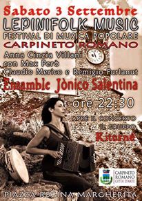 Ensamble Jonico Salentina @ Carpineto Romano Sabato 3 Settembre a Carpineto Romano in Piazza Regina Margherita LEPINART mercatino dell’artigianato artistico Ore 22.00 Piazza Regina Margherita LepiniFolk Music festival di musica popolare ENSAMBLE JONICO SALENTINA -CEPRANO con Anna Cinzia Villani Voce e tamburi Claudio Merico Violino Max Però Organetto voce e tamburo Remigio Furlanut chitarra e contrabbasso