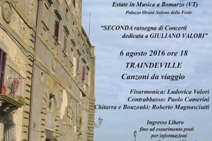Nuovo appuntamento con i Traindeville al Palazzo Orsini di Bomarzo (VT) nella splendida cornice del Salone delle Feste. La band partecipa anche quest’anno all’estate bomarzese nella rassegna dedicata al musicista Giuliano Valori scomparso due anni fa. Il gruppo – composto da Ludovica Valori alla fisarmonica e alla voce e Paolo Camerini al contrabbasso e ai loop – si esibirà questa volta in trio con la partecipazione di Roberto Magnasciutti degli Her Pillow (storica formazione Irish-rock in cui ha militato per…