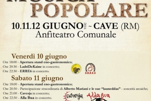 Dal 10 al 12 Giugno 2016 si svolgerà a Cave il primo festival di Musica popolare di Cave. Sei Band si alterneranno sul palco dell’Anfiteatro di Cave, in via degli Astronauti, dalle 20:00 in poi, mentre alle 18:30 dell’11 giugno si esibiranno, i “Piccoli Tamburellisti di Cave”. L’evento, organizzato dai Cavesja, una band locale, prevede band come i Tamburellisti di Torrepaduli e gli Alla Bua, direttamente dal Salento, il Salta…Pizzica da Ferentino (Frosinone), gli LDK (Ladri de Kaine) e gli…