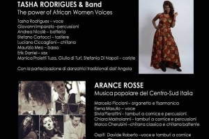 Domenica 22 maggio 2016 alle ore 21:00 Festival Mediterraneo dell’incontro 3^ ed. L’Africa incontra il Sud Italia Etnochoreia, in collaborazione con Officina della Cultura, con il Patrocinio del Municipio Roma IX Eur, presenta un doppio concerto: TASHA RODRIGUES & Band h 21:00 + ARANCE ROSSE h 22:00 La cantante angolana Tasha Rodrigues, indomabile guerriera armata di trascinante energia e voce decisa, forte ed emotivamente coinvolgente nel suo concerto sceglie di eseguire le voci di donne africane, protagoniste nella lotta per…