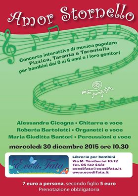 La libreria Eco di Fata di Roma organizza il 30 Dicembre alle 10.30 un concerto interattivo di musica popolare, per mettere insieme grandi e i bambini a ballare Pizzica, Taranta e Tarantella.