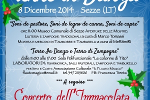 Tutto in un unico giorno, a Sezze (LT), l’ 08 dicembre sarà già Natale con: Francesca Trenta, i Meritmirì, Marco Tomassi e la zampogna gigante già a partire dalle ore 11.00 con una mostra mercato sulla liuteria e le zampogne tradizionali, Tammorre e tamburelli. A seguire laboratorio di fisarmonica,ballo tradizionale e tamburello. Dalle 18.00 Concerto dell’Immacolata con ingresso gratuito.