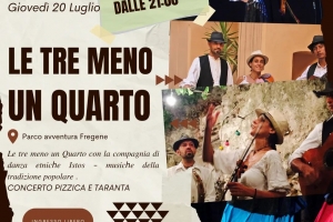 Le tre meno un Quarto @ Fregene (RM) con ℎ – ℎ INGRESSO LIBERO Dalle 21:00 al Parco Avventura di Fregene Evento all’interno del @SUDFUDFESTIVALSUMMEREDITION è un gruppo musicale che propone le canzoni più famose della tradizione popolare del centro e sud Italia. Il repertorio proposto spazia da canti a cappella dedicati al puro ascolto a musica da ballo, ripercorrendo le regioni del sud Italia come in un vero e proprio viaggio sonoro: dai valzer siciliani al canto sul tamburo…