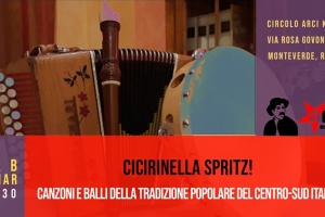 Cicirinella Spritz @ Roma Sabato 7 marzo ci aspetta una serata all’insegna della musica popolare tradizionale del centro-sud Italia; Cicirinella Spritz al Circolo Kokè di Roma All’inizio la musica sarà soft e melodica, con canzoni e ballate, per poi diventare più coinvolgente con i ritmi della tammurriata e proseguirà con l’invito a ballare tutti insieme il saltarello, la tarantella e la pizzica per lasciarsi andare e tirar fuori tutta l’energia che si ha dentro! Alessandro Di Cicco (voce e percussioni),…
