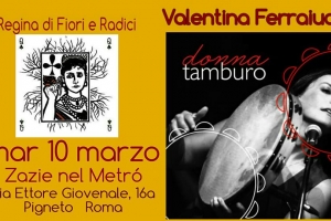 Valentina Ferraiuolo @ Roma Direttamente dalla sua Gaeta, la” Regina” del tamburo: Valentina Ferraiuolo. Appassionati dei ritmi popolari, dei tamburelli e delle cornici in generale, segnate la data, perché un’artista così talentuosa, di grande esperienza, così verace e vivace è una gioia immensa sentirla da vicino. Imperdibile! martedì 10 marzo, puntuali alle 21,00 si inizia, al solito ingresso libero!