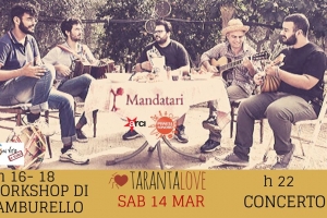 Taranta Love Festival @ Roma SABATO 14 MARZO 2020 Circolo Arci Pianeta Sonoro presenta: MANDATARI live + Workshop di tamburello 2019/20 6:00 – 18:00 → “STAGE DI TAMBURELLO TARANTO, TARANTA E TAMBURIEDDU” a cura di Salvatore Cavallo Galeanda : → Inizio Concerto – MANDATARI 00.00 SI CONTINUA A BALLARE E SUONARE CON LE RONDE SPONTENEE E SELEZIONE DI BRANI DI PIZZICA E MUSICA DA BALLO DEL POPOLARE IL SEMINARIO Lo Stage sarà tenuto dal presidente dei Mandatari “Salvatore Cavallo Galeanda”…