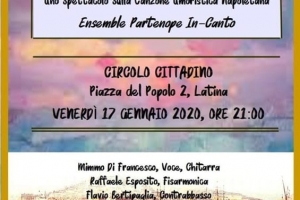 Napulitanata @ Latina Napulitanata al Circolo Cittadino Un vero e proprio tuffo nelle calde atmosfere partenopee quello che si svolgerà al Circolo Cittadino di Latina venerdì 31 gennaio con il concerto dell’Ensemble Partenope InCanto “Napuletanata, la grande tradizione partenopea, dalla musica popolare al periodo classico“. Un viaggio nella grande tradizione musicale napoletana le tarantelle del sei-settecento come “Lo Guarracino”, “Cicerenella”, i canti sei-settecenteschi pervenutici grazie all’opera di raccolta di Guglielmo Cottrau, fino ai grandi temi del cosiddetto periodo classico della canzone napoletana….