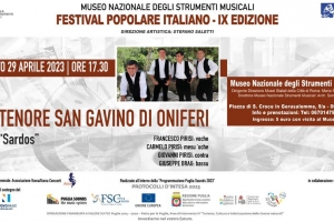 Il canto tradizionale sardo @ Roma L’affascinante canto a tenore, patrimonio dell’Unesco, protagonista del secondo appuntamento con il Festival Popolare italiano diretto da Stefano Saletti al Museo Nazionale degli Strumenti Musicali. Il 29 aprile alle 17.30 sarà di scena il gruppo dei Tenore San Gavino di Oniferi, ensemble impegnato da molti anni nella pratica e nella diffusione del canto a tenore per valorizzare il patrimonio musicale, letterario e linguistico della Sardegna. In questo concerto presentano il nuovo disco in uscita…
