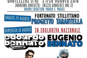 Tarantelliri @ Castelliri (FR) Tarantelliri-Festival di musica popolare XI edizione Castelliri (FR) – 24/25 agosto 2019 – Ingresso Gratuito Nuova location: Piazza E. Macci – Inizio concerti ore 22:00 —————————— Sabato 24 agosto – Dalla Calabria FORTUNATO STILLITTANO – PROGETTO TARANTELLA —————————— Domenica 25 agosto – In esclusiva nazionale: EDOARDO & EUGENIO BENNATO in concerto ——————————- L’undicesima edizione di Tarantelliri verrà dedicata ad un amico speciale: Giancarlo Paglia