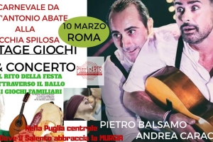 Carnevale Pugliese @ Roma Il Carnevale Pugliese e le sue feste Familiari si spostano a Roma. La Puglia centrale dove la Murgia abbraccia il Salento , Per la prima volta, un incontro di formazione popolare che genera la possibilità di imparare i giochi e le feste della zona di Taranto Brindisi e Bari Sud attraverso la danza e i balli tradizionali. Mastri Pietro Balsamo & Andrea Caracuta I due danzatori d’eccezione dall’alto al basso salento. Domenica 10 Marzo puoi vivere…