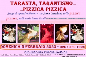 Taranta, Tarantismo, Pizzica Pizzica @ Roma TARANTA, TARANTISMO… …PIZZICA PIZZICA Stage di approfondimento con Anna Cirigliano sulla pizzica pizzica, nelle varie forme locali (Corigliano, Cutrofiano, Martano, Cisternino, ecc.) GRATUITO per chi frequenta il corso del venerdì di danze popolari alla scuola Choros. Piccolo contributo di 5 euro per i bambini della Compagnia popolare dei bambini. Costo per gli esterni alla scuola: 25 euro (20 per iscritti Choros ad altri corsi) DOMENICA 5 FEBBRAIO 2023 ORE 10:30-12:30 NECESSARIA PRENOTAZIONE