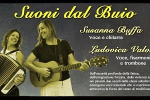Susanna Buffa e Ludovica Valori @ Roma “Suoni dal buio”, Susanna Buffa e Ludovica Valori Dall’oscurità profonda della fatica, dell’emigrazione forzata, della violenza subìta nei passati due secoli dalle classi subalterne, emergono voci resistenti che si esprimono attraverso la forza del canto di tradizione popolare. Susanna Buffa, voce e chitarra, e Ludovica Valori, voce, fisarmonica e trombone, fanno da guida in questo viaggio dal buio verso al luce le cui tappe sono i canti narrativi e quelli del lavoro, le…