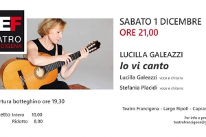 Lucilla Galeazzi @ Capranica (VT) Al teatro comunale Francigena c’è “Io vi canto”. Lo spettacolo di Lucilla Galeazzi e Stefania Placidi sabato 1 dicembre alle 21. Lucilla Galeazzi negli anni 70-80 comincia a cantare nell’ambito del folk revival con Giovanna Marini. A partire dalla seconda metà degli anni ’90, si dedica alla carriera di solista, realizzando sia dischi e progetti suoi, sia collaborazioni con musicisti di differente provenienza: esponenti importanti del jazz francese, come il chitarrista Claude Barthelemy, il violoncellista Vincent Courtois, il…