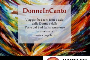 DonneInCanto @ Roma Venerdì 29 SETTEMBRE 2017 ore 21 Il MAMELI27 presenta: L’Orchestra Sentieri Popolari, diretta dal Maestro concertatore Leonardo Gerino, in “DonneInCanto” Viaggio fra i toni forti e caldi delle Donne e delle Terre del Sud Italia attraverso la Storia e la musica popolare. Musica e recitazione in un unico atto Lo spettacolo originale DonneInCanto è una rappresentazione musicale sulla condizione femminile nel Sud Italia raccontata attraverso villanelle, canti tradizionali d’amore, di lotta e di lavoro accompagnati dalla recitazione…