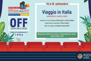 Viaggio in Italia – cantando le nostre radici @ Roma 15 – 16 SETT // (ore 21.00) INAUGURAZIONE di “OFF – l’Estate non si spegne”, la rassegna di fine estate dell’HUB culturale di Officina Pasolini, che si concluderà l’8 ottobre. Si comincia con: “Viaggio in Italia – cantando le nostre radici” A cura di Tosca, Felice Liperi e Paolo Coletta Supervisione musicale di Piero Fabrizi Mise en espace di Massimo Venturiello Viaggio in Italia è un concerto-spettacolo frutto di un…
