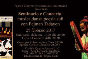 Pejman Tadayon @ Roma Pejman Tadayon e Associazione Incontrando presentano Seminario e Concerto musica,danza,poesia sufi con Pejman Tadayon 25 febbraio 2017 Seminario dalle 17,00 alle 20,00 Cena e Concerto dalle 20,30 Seminario introduttivo alla conoscenza pratica degli elementi basilari della musica e della danza rituale dei Sufi. I partecipanti potranno apprendere alcuni ritmi eseguiti con i tamburi tipici della tradizione , conoscere gli strumenti musicali tradizionali ed alcuni brani di canti Sufi e della musica sacra islamica. Al tempo stesso…