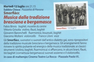 Smorfiàcc @ Sabbio Chiese (BS) Martedì 12 Luglio per Acque e Terre Festival, la piazzetta di Pavone a Sabbio Chiese ospiterà il concerto folk degli Smorfiàcc, con uno sguardo sulla cultura etnico-popolare locale e d’oltralpe. Martedì 12 luglio alle ore 21,15 settimo appuntamento della dodicesima edizione di Acque e Terre Festival, rassegna che offre anche quest’anno uno sguardo sulla cultura etnico-popolare, ospitando appuntamenti musicali che si fanno tramite delle diverse tradizioni folk, proponendo contaminazioni tra singolari sonorità, in un continuo…