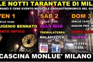 Le Notti Tarantate @ Milano Venerdì 1, sabato 2 e domenica 3 ottobre 2021 tornano le Notti Tartantate di Milano: l’appuntamento, per tre giorni, è negli spazi all’aperto della Cascina Monluè (via Monluè 87, Milano) con pranzi e cene a base di piatti tipici del Sud Italia, mercatini multietnici e concerti nel rispetto delle normative anti Covid-19 vigenti. Tra gli ospiti musicali Eugenio Bennato e Canto Antico, Tremulaterra e Domo Emigrantes. Milano –Di seguito il programma delle Notti Tarantate di Milano 2021: Milano –Venerdì 1 ottobre Ore 19.00: cene…