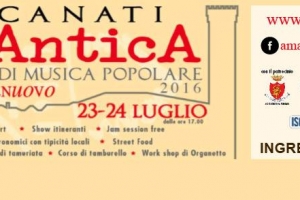 AmAntica folk Festival a Recanati (MC) Dal 23 al 24 luglio a Castelnuovo, il rione più antico e ricco di storia di Recanati, ci sarà la 7° edizione del festival folk AmAntica dove si esibiranno e alterneranno famosi gruppi di musica popolare e giovani animati da tanta sana voglia di divertimento. PROGRAMMA di AmAntica: VENERDÌ 22 LUGLIO Presso Piazzetta Santa Maria in Castelnuovo Aspettando Amantica Cena su prenotazione presso circolo Acli Castelnuovo Balli folk con Les Folkrobates Live show: Sembene…