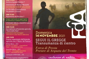 “Segui il gregge. Transumanza di rientro” @ Arquata del Tronto (AP) Un appuntamento interamente dedicato all’antica tradizione della transumanza. Il Festival dell’Appennino 2021 torna domenica 14 novembre in versione autunnale con la tappa “Segui il gregge. Transumanza di rientro”, che farà ripercorrere l’antica via dei pastori da Forca di Presta a Pretare di Arquata del Tronto per poi intrattenersi con approfondimenti, laboratori, pranzo della tradizione e ovviamente tanta musica popolare. Un programma ricco, reso possibile anche grazie alla collaborazione delle due aziende agricole “Le…
