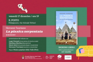 La pizzica serpentata @ Melpignano (LE) Prosegue la rassegna “Libri di Puglia”, il ciclo di incontri dedicati alla promozione del libro e della lettura realizzato dall’Associazione Pugliese Editori con il sostegno della “Teca del Mediterraneo” – Biblioteca del Consiglio regionale della Puglia. Il prossimo appuntamento è per venerdì 17 dicembre a Melpignano presso il circolo culturale “Il Posto” (via Vicinale Vottari) dove sarà presentato “La pizzica serpentata” (Kurumuny) di Giovanni Taurisano. Saranno presenti, oltre all’autore e musicista, Luigi Chiaratti (ricercatore…