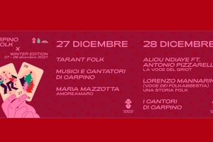 Carpino in Folk-Winter edition (FG) Due giorni a tutto Folk. Sul Gargano è di nuovo il tempo del Carpino in Folk-Winter edition. “Abbiamo scelto due date per vederci, incontrarci, stare insieme, ancora una volta, tutti insieme, in un’isola felice fatta di musica, tradizione e spensieratezza in questi tempi difficili”, spiegano gli organizzatori. “Abbiamo scelto il 27 dicembre, numero che simboleggia il servizio e la cooperazione. Simboleggia anche l’introspezione, la consapevolezza spirituale e una maggiore comprensione di tutte le cose; ed…