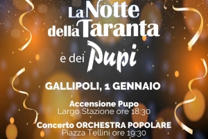 La Notte dei Pupi e della Taranta @ Gallipoli (LE) Torna la musica in piazza a Gallipoli con La Notte dei Pupi e della Taranta in programma l’1 gennaio 2022. I gallipolini e i turisti torneranno a ritrovarsi in piazza Tellini per festeggiare il nuovo anno a ritmo di pizzica con lo straordinario spettacolo dell’Orchestra Popolare. Un progetto che consolida l’asse vincente tra musica e arte della cartapesta. I maestri pupari dell’Associazione Cantieri del Capodanno per l’occasione realizzeranno il PUPO…