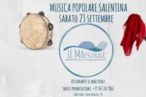 Musica Popolare Salentina @ Torre Vado (LE) Serata di musica popolare salentina al Ristorante Il Maestrale SABATO 23 settembre Un assaggio di Salento al Ristorante Il Maestrale La magia di questo evento vi trasporterà in un vero e proprio viaggio attorno alla cultura salentina, attraverso la pizzica, partendo dalla sua origine per poi trattare la sua evoluzione e le sue diverse sfaccettature di stile e di ballo. Se non conosci questo ballo è l’occasione per viverlo, se già lo vivi…