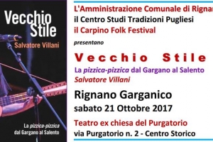 Salvatore Villani @ Rignano Garganico (FG) Sarà presentato a Rignano Garganico il nuovo lavoro editoriale di Salvatore Villani. Si tratta di un cd-book dedicato alle Tarantelle del Gargano e del Salento. “Ogni opera, come questa mia piccola testimonianza, nasce dal connubio di determinazione personale e casualità: devo ad una esplicita sollecitazione del maestro Roberto Leydi i miei studi sulla chitarra battente e la musica garganica e a Giovanna Marini, con cui duetto in un canto di lavoro di Ischitella, il…