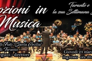 Emozioni in musica: Taranto e la sua Settimana Santa “Emozioni in musica: Taranto e la sua Settimana Santa”: è il titolo del concerto di solidarietà che la Grande Orchestra di Fiati “Santa Cecilia-Città di Taranto” diretta dal maestro Giuseppe Gregucci terrà giovedì 23 marzo al Teatro Orfeo. Presenta Rosalba De Giorgi. Sipario alle ore 21. In programma, una selezione di brani musicali che costituiscono la colonna sonora dei nostri riti tradizionali della Settimana Santa. Il concerto, patrocinato dal Comune di…