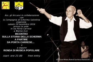 Coltelli danzanti @ Matino (LE) Nell’atrio di Porta Carrese a Matino (LE) si terrà un appuntamento imperdibile con la musica popolare e il duello con coltello. “Coltelli danzanti” è il titolo dell’iniziativa messa in atto dall’associazione Gli arcueri in collaborazione con la Compagnia di Scherma salentina per Sabato 19 Novembre. Gli appassionati potranno assistere a un incontro sulla storia della scherma alle ore 21.00 e, a seguire, si ballerà sui ritmi della pizzica salentina con l’animazione di una ronda di…
