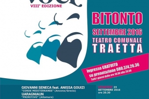 Di voce in voce @ Bitonto (BA) Tre giorni intensi di eventi, due concerti al giorno intorno al pentagramma del Mediterraneo. Nella cornice del teatro Traetta. Da venerdì 23 settembre, a domenica, 25 settembre. C’è davvero da soddisfare tutti i gusti, perché si va dalle suggestioni vocali di Anissa Gouizi e si finisce con il quintetto toscano Italian Klezmer Kapelve, per passare dai “Radicanto”, che festeggiano i venti anni di carriera, il “Carro dei comici” e dal duo Rachele Andrioli…