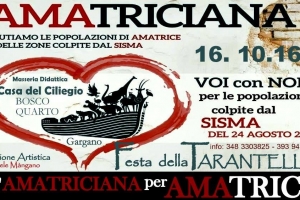 Un’amatriciana per Amatrice e Festa della Tarantella @ Monte Sant’Angelo (FG) L’evento si svolgerà Domenica 16 ottobre, alle ore 13.00, nello splendido scenario del BOSCO QUARTO del Gargano presso “LA MASSERIA CASA DEL CILIEGIO” a Monte Sant’Angelo. Lo scopo è quello di raccogliere fondi per Amatrice. Si è deciso con altre associazioni di volontariato come l’AVIS di Manfredonia , La Bella Cumpagnie Folk, Masseria Casa del Ciliegio e gli sponsor Panificio Bisceglia di Monte Sant’Angelo -Antica Tradizionale Liquori Artigianale del Gargano di…