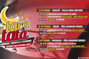 Ta.Tara.Tatà – Bitonto Folk Festival (BA) Torna “Ta.Tara.Tatà – Bitonto Folk Festival”, la “tre giorni” con la musica popolare giunta alla sua settima edizione con l’organizzazione dell’associazione Folkèmigra. Da venerdì 9 a domenica 11 settembre si terrà l’atteso appuntamento con il folklore e con le antiche danze tradizionali della Terra di Bari. Un fiume di colori, suoni ed energia invaderà la città di Bitonto, con un festival unico nel suo genere nell’area metropolitana. Un festival pronto a divertire con pizzica,…