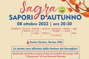 Sagra “Sapori d’Autunno” @ Bovino (FG) Sagra “Sapori d’Autunno”, anche quest’anno ecofesta, in programma sabato 8 ottobre, a partire dalle 20.30. “Dopo lo straordinario successo di presenze registrate nell’ultima edizione pre-covid (2019) – si legge in una nota stampa -, anche quest’anno il Borgo Antico di Bovino vi aspetta lungo le vie del gusto e dei ricordi, per degustare caldarroste, salsiccia e broccoli, minestra di ceci e fagioli, porchetta, torcinelli, bruschetta contadina, formaggi e salumi e tanto buon vino. Nel corso della…