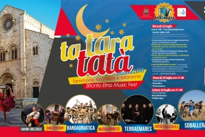 L’associazione Folkèmigra organizza per il secondo anno consecutivo il Bitonto Etno Music Fest,il festival delle musicalità del mediterraneo.Il festival,unico nel suo genere in tutta l’area metropolitana barese,nasce dall’esigenza di salvaguardare e tramandare l’enorme patrimonio di canti,balli e musiche della nostra terra caduti nell’oblio,a volte volontario,della frenetica vita contemporanea.L’acronimo ta.tara.tatà deriva da tra parole chiave della tradizione musicale.Le TAmmorre,strumenti a percussione costruiti artigianalmente con pelle di capra e fasce di faggio impiallacciate manualmente una sull’altra;TARAntelle,la musica tipica di tutto il sud…