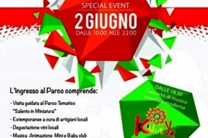 SALENTO IN MINIATURA presenta SPECIAL EVENT, 2 Giugno 2016 dalle 10.00 alle 22.00 Tantissime le attività in programma per tutta la giornata che vedrà nel gran finale il Concerto di Musica popolare moderna a cura del gruppo KalurYa. A pranzo e Cena disponibile la Sala Ristorante ed il servizio Tavola Caldo all’esterno presso il Porticato della Piazza Eventi. Gradita sempre la prenotazione al 342.7022278 / 392.9656165. Grande protagonista della giornata l’ormai noto percorso “Salento in Miniatura” un’esperienza unica e divertente…