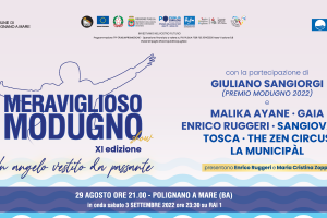 Meraviglioso Modugno Show @ Polignano a Mare (BA) MERAVIGLIOSO MODUGNO SHOW “UN ANGELO VESTITO DA PASSANTE” serata-evento dedicata all’opera di DOMENICO MODUGNO XI EDIZIONE lunedì 29 AGOSTO 2022, ore 21:00 @ Polignano a Mare (BA) e sabato 3 SETTEMBRE 2022, ore 23:30 @ RAI 1 con la partecipazione di GIULIANO SANGIORGI (PREMIO MODUGNO 2022) e MALIKA AYANE, GAIA, ENRICO RUGGERI, SANGIOVANNI, TOSCA, THE ZEN CIRCUS e LA MUNICIPÀL presentano ENRICO RUGGERI e MARIA CRISTINA ZOPPA un format di Franca Gandolfi Modugno e Maria Cristina Zoppa prodotto da Massimo Bonelli – iCompany…