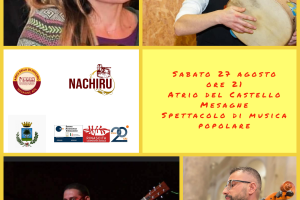 Pizzica… e non solo @ Mesagne (BR) Sabato 27 agosto alle ore 21, nell’Atrio del Castello di Messane, spettacolo di musica popolare “pizzica … e non solo” con la partecipazione di Anna lì e i musicisti del Progetto NACHIRU. È un’iniziativa dell’associazione AMICI DELLA DIVITTORIO APS – MESAGNE, con il patrocinio della città di Mesagne nell’ambito del progetto del SAI – Cooperativa Rinsavita “Lo spettacolo dell’inclusione”. Ingresso libero, fino ad esaurimento dei posti. Anna Lì (Annalia Bianca Maria Cavaliere, avvocata di professione, musicista…