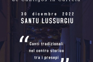 Cuncordos de Cantigos in carrela @ Santu Lussurgiu (OR) Una passeggiata arricchita da musica e canti tradizionali: è “Cuncordos de Cantigos in carrela”, un’edizione straordinaria di “Cantigos in carrela”, la manifestazione organizzata dall’associazione culturale lussurgese “Aidos”, che ogni anno, generalmente una settimana prima del carnevale, allieta e accompagna i visitatori nelle vie del paese. Venerdì 30 dicembre, a partire dalle 16, nelle piazze del centro storico di Santu Lussurgiu si esibiranno i cori Cuntzertu Abbasantesu di Abbasanta, Cuntzertu Norghiddesu a ’Oghe Bathia di Norbello, Coro…